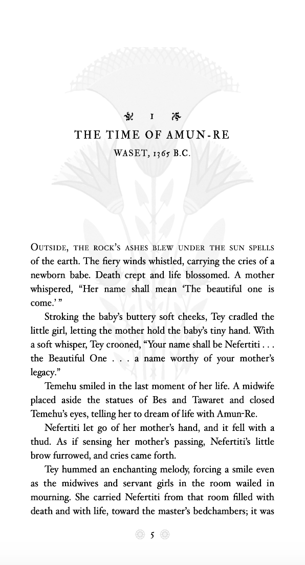 Tey hummed an enchanting melody, forcing a smile even as the midwives and servant girls in the room wailed in mourning. She carried Nefertiti from that room filled with death and with life, toward the master’s bedchambers; it was time for Nefertiti to be blessed by her father, Ay, brother of the Queen of Egypt. Tey slowed to a stop as Nefertiti fell asleep in her arms.