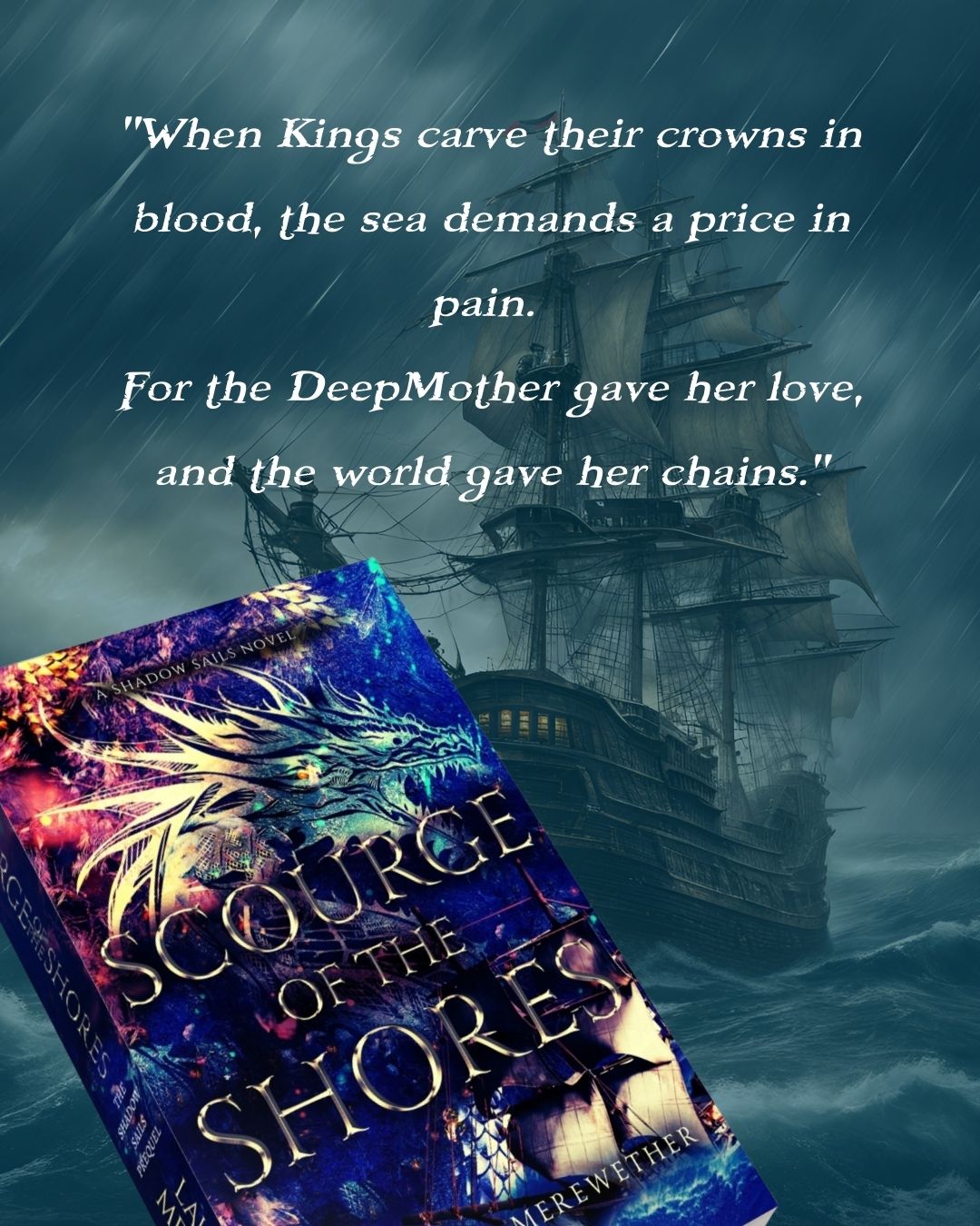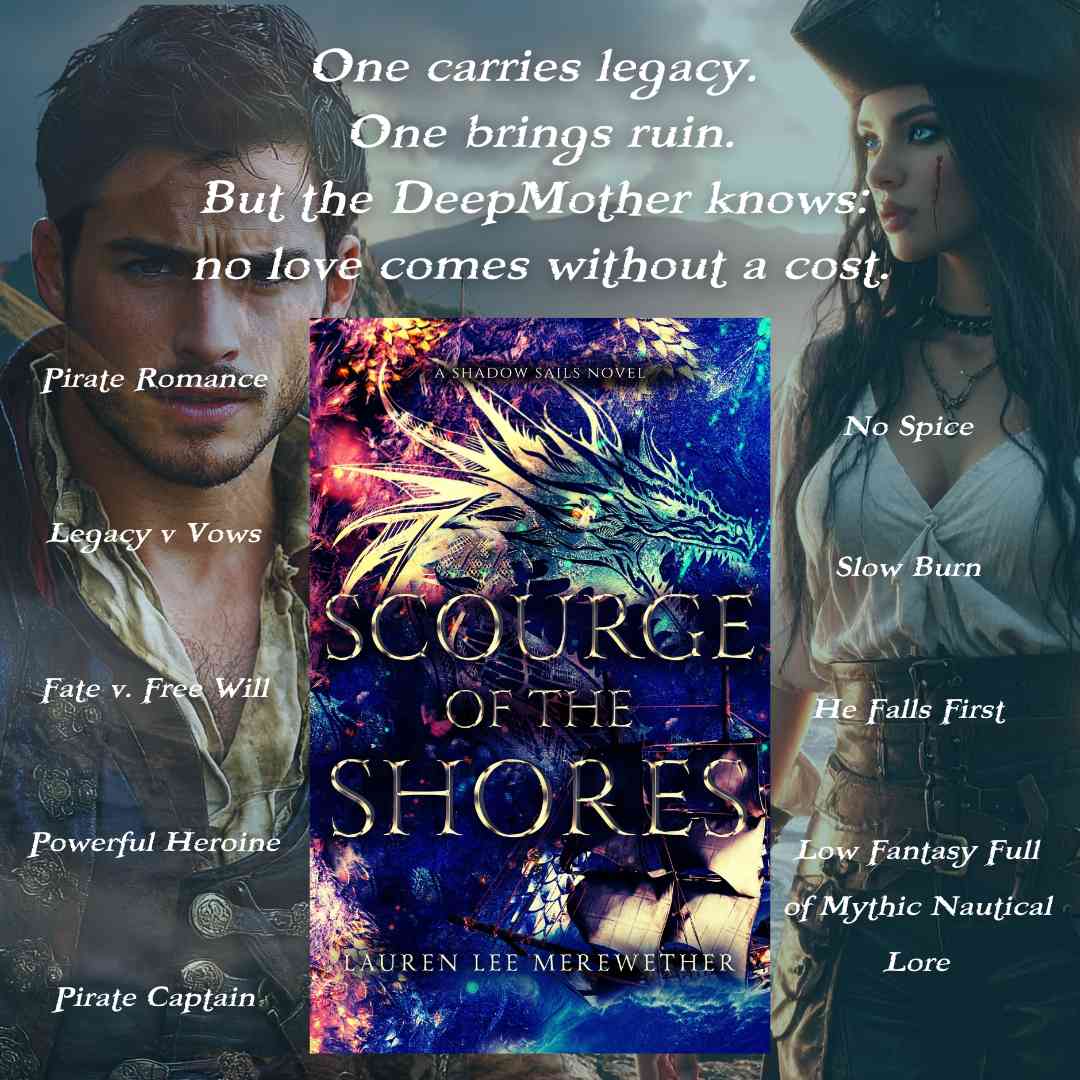 The Shadow Sails: Scourge of the Shores is a slow-burn, closed door pirate romantasy set in a dark world with high-stakes romance, political intrigue, morally gray characters, and a world where love might be the most dangerous treasure of all.