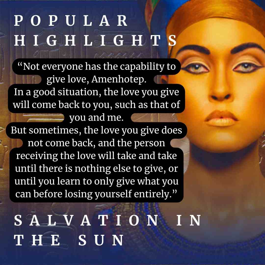 She followed the servant boy out as he closed the door behind them. At its close, Tey could sense Ay’s pain through the walls. She held Nefertiti close to her heart and buried her head into the child’s wriggling warmth. With tears streaming down her face, she whispered, “Your mother was loved . . . and so you will be, the daughter of Ay.”