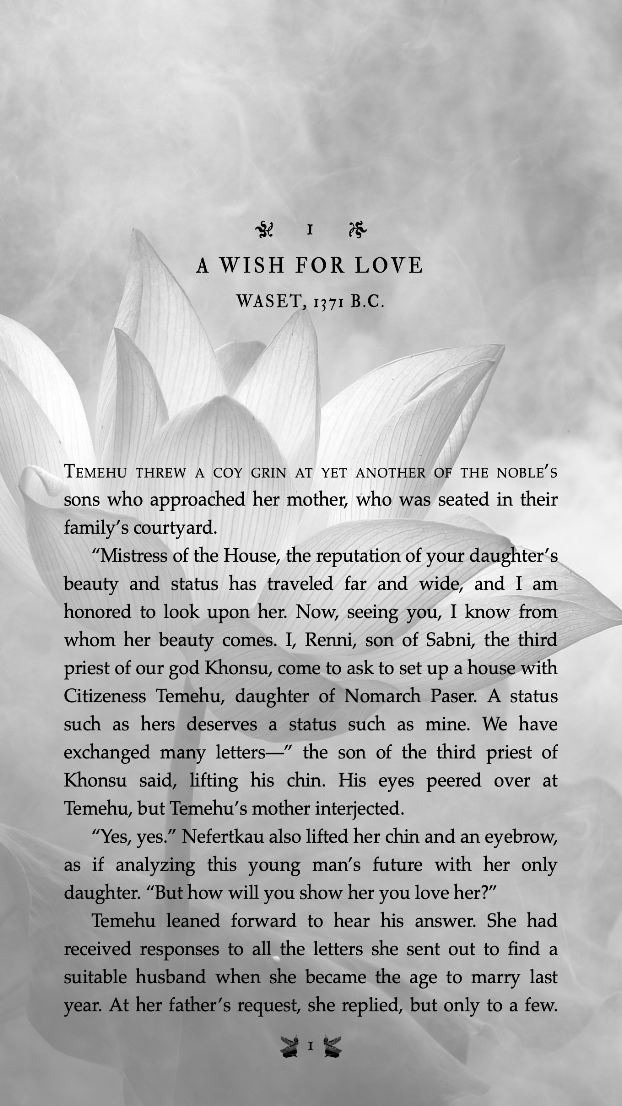 “Mistress of the House, the reputation of your daughter’s beauty and status has traveled far and wide, and I am honored to look upon her. Now, seeing you, I know from whom her beauty comes. I, Renni, son of Sabni, the third priest of our god Khonsu, come to ask to set up a house with Citizeness Temehu, daughter of Nomarch Paser. A status such as hers deserves a status such as mine. We have exchanged many letters—” the son of the third priest of Khonsu said, lifting his chin. His eyes peered over at Temehu, but Temehu’s mother interjected.