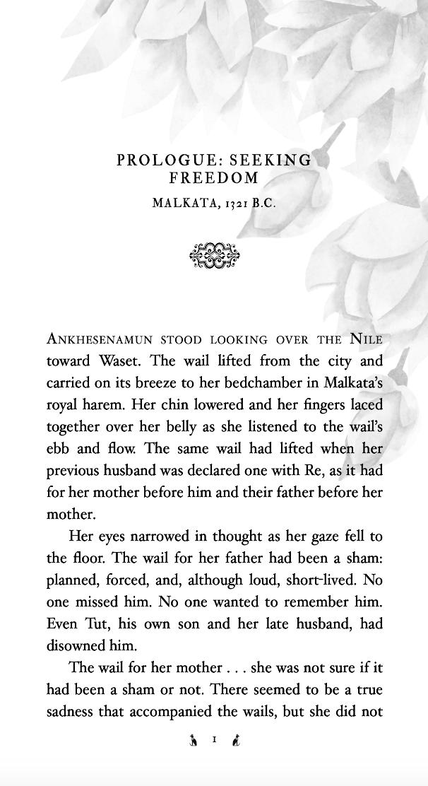 “Forgive me. I am so tired of being the royal wife passed from Pharaoh to Pharaoh. First, married to our father, then you, now my grandfather, next Nakhtmin or Horemheb”—a heavy sigh fell from her mouth—“and the next after him, for I will surely outlive either one . . . I will be doomed to the royal harem, alone and forgotten, with Sennedjem in the training yard as a precious bait.” Her fingers brushed her lips as she thought of Sennedjem’s kiss in the prior month when she had asked him to leave Egypt with her.