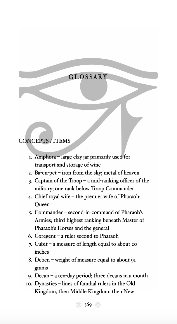 “Chief royal wife,” Sennedjem said, interrupting her thoughts as he looked at her wobbly legs. “My Queen, perhaps we rest for now.” He gazed up at the sky, shielding his eyes from the sun’s rays; they had been out in the sun for the better part of the day.