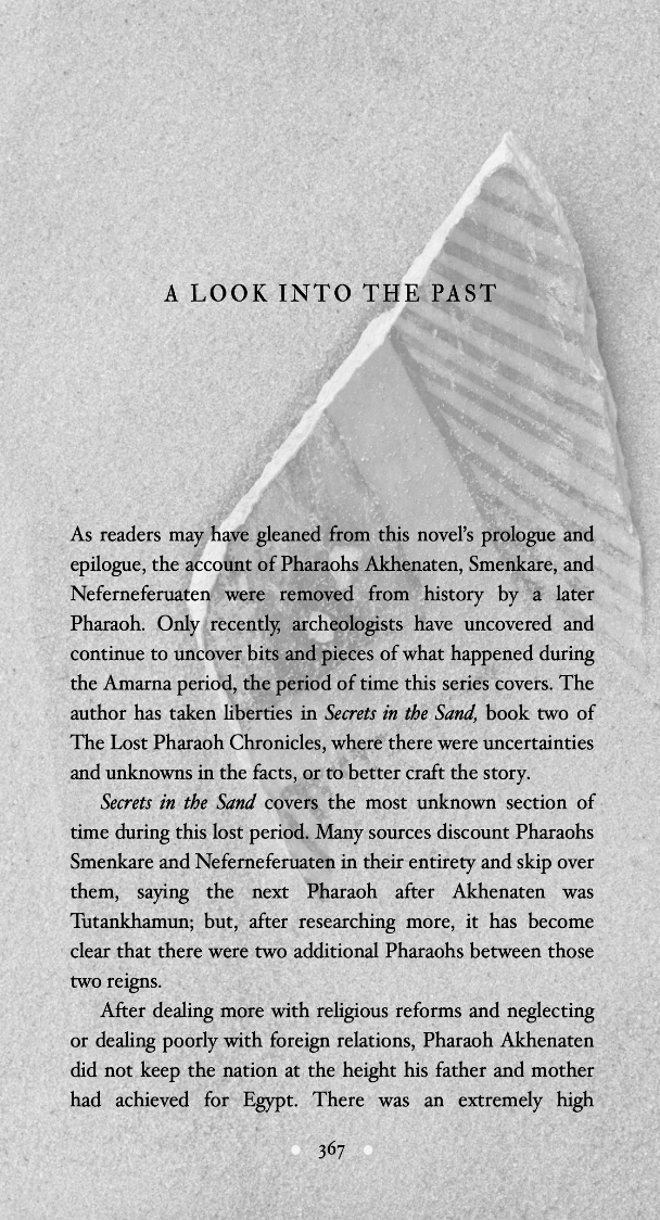 Ay stood up straight and peered down at this enemy he had to call an ally. When this is all over, I will make you pay for forcing my hand and persuading my firstborn to murder her husband. He gritted his teeth at the thought and put his hand on the top of the dagger’s handle that hung from his belt. You can threaten your rebellion—you can imply my men will betray me . . . and now, having no other option, I have gone along with your plan to return Egypt to its former glory. But, in the end, I may even kill you for what you have made me do to my Nefertiti, my precious lotus blossom.
