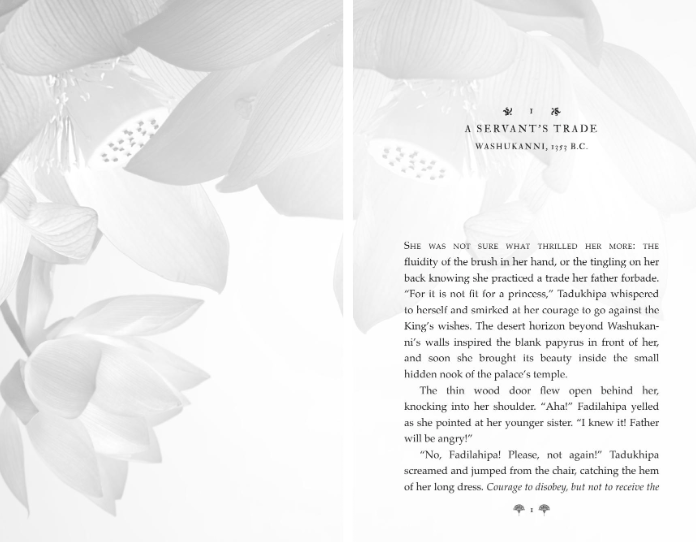 She was unsure what thrilled her more: the fluidity of the brush in her hand, or the tingling on her back knowing she practiced a trade her father forbade. “For it is not fit for a princess,” Tadukhipa whispered to herself and smirked at her courage to go against the King’s wishes. The desert horizon beyond Washukanni’s walls inspired the blank papyrus in front of her, and soon she brought its beauty inside the small hidden nook of the palace’s temple.